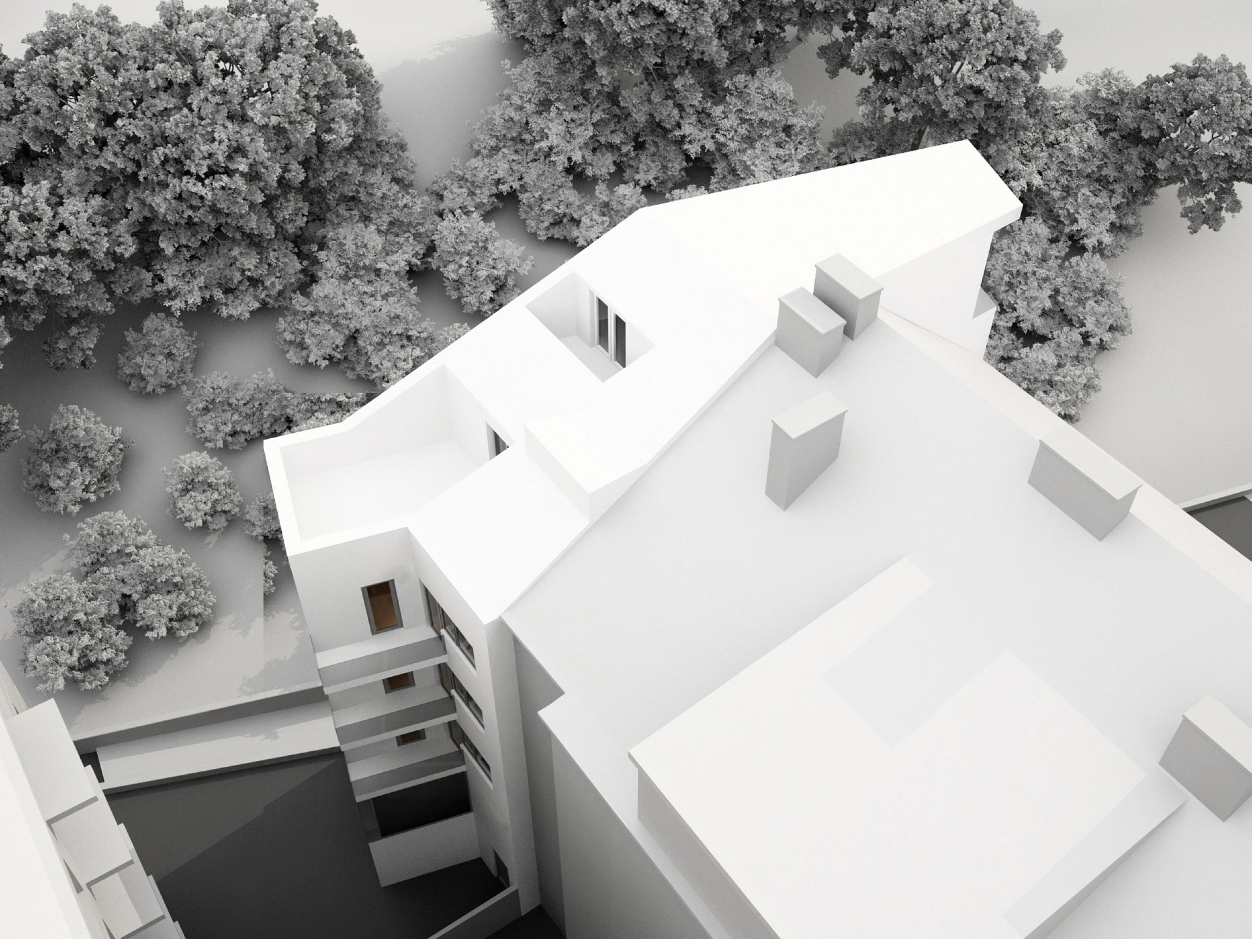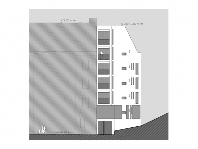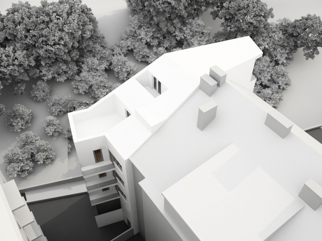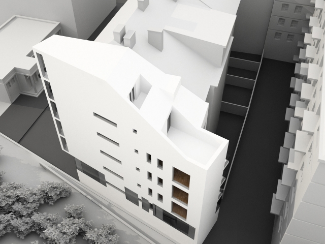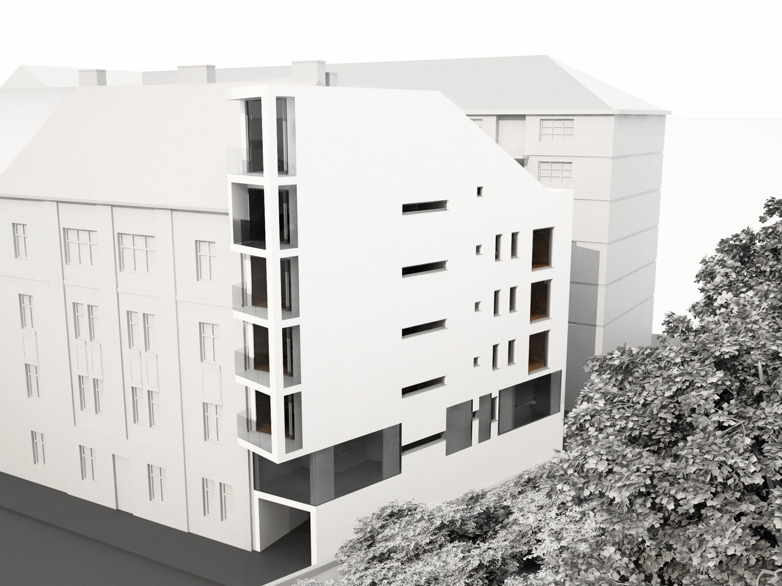 Návrh bytového domu v Praze 8 - Libni prověřil naše schopnosti pracovat s výrazně omezeným prostorem. Neširoká parcela mezi existujícím blokem budov a valem železniční tratě měla být využita pro budovu, která nabídne nové byty a zároveň obnoví adekvátní zakončení řady domů, narušené zbouráním činžovního domu před stavbou železničního valu.
