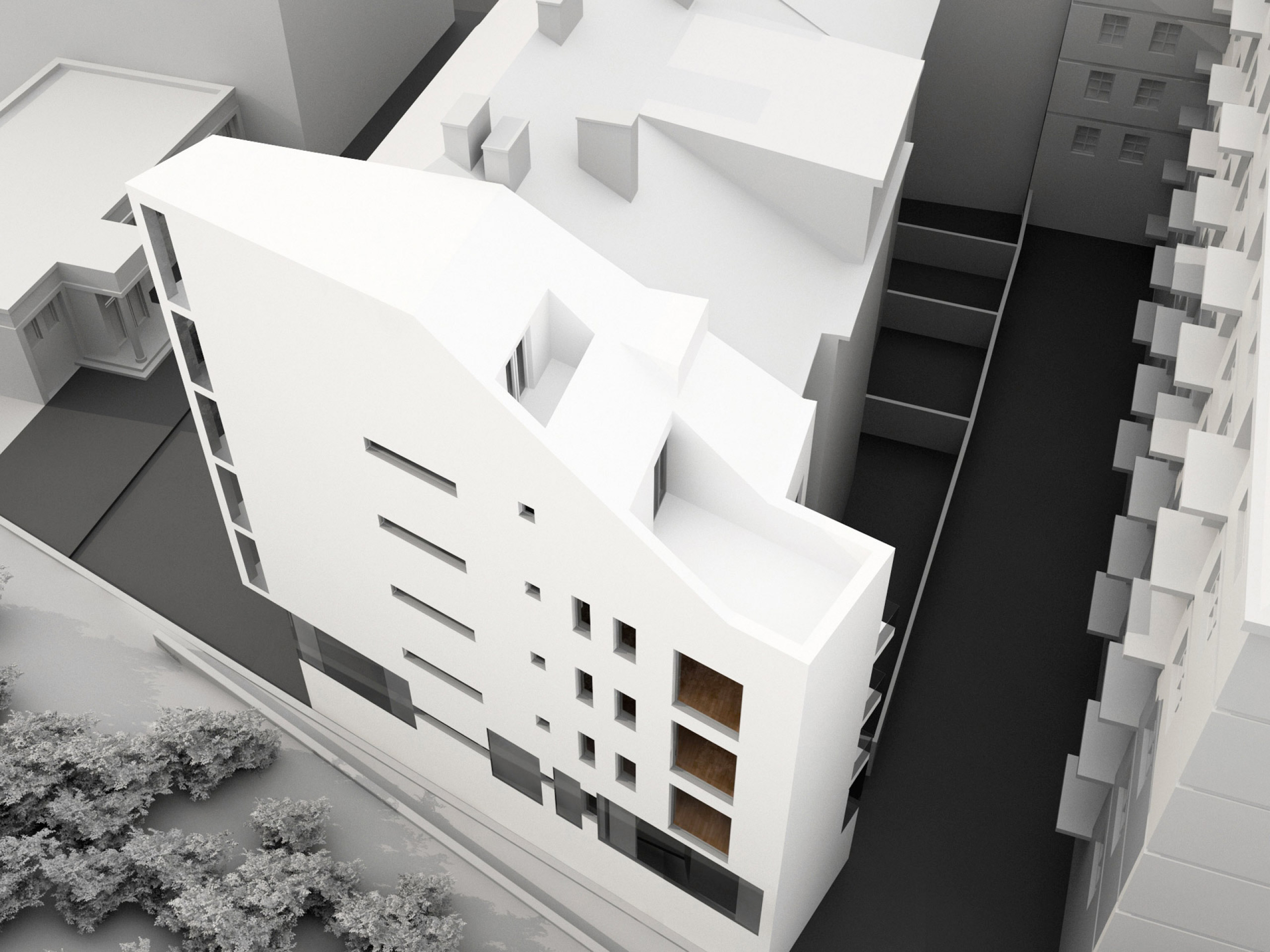 Navržený dům přímo navazuje na blok budov a třebaže využívá celou šířku parcely, nezaplňuje její veškerý prostor. Zatímco uliční fasáda respektuje tzv. uliční čáru, dvorní fasáda byla umístěna do úrovně výrazného rizalitu sousedního domu, čímž byl definován základní, lichoběžníkový půdorys domu. Ten byl následně dotvořen novým výběžkem ve směru do vnitrobloku, jenž pomáhá uzavřít celý blok budov a zvyšuje intimitu vnitrobloku.