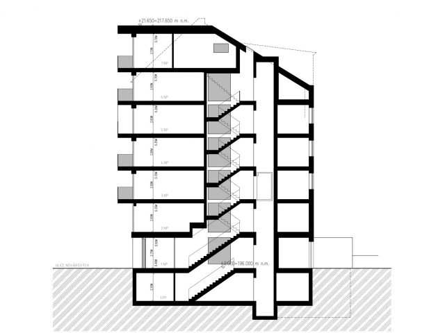 Vzhledem k charakteru projektu jakožto dostavby bloku se návrh výškově, půdorysově i co do tvaru střešních rovin absolutně podvolil rozměrům stávajících okolních budov. Ve dvorní části navazuje sklonem a výškovým umístěním střešní roviny na střechu sousedního objektu, přičemž v hřebeni končí o necelý metr níže. V porovnání s protějším domem v ulici na Žertvách je pak rozdíl výšek ještě mnohem výraznější. Do ulice Novákových je pak navržený dům řešen s rovnou střechou, jakožto vikýřem.