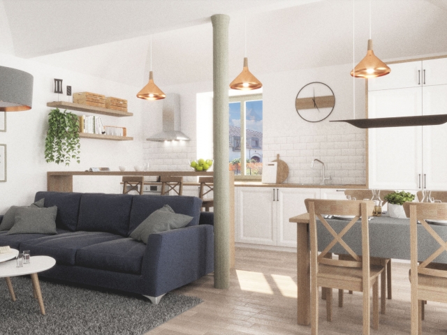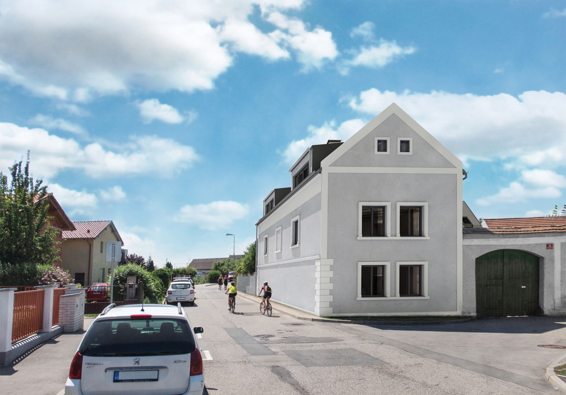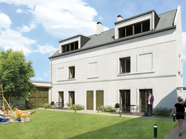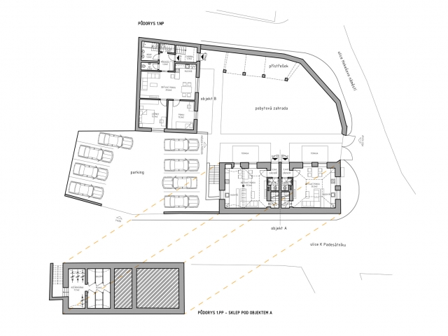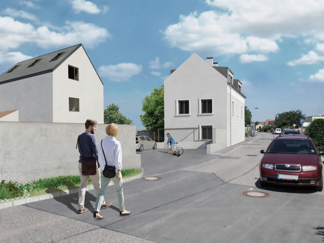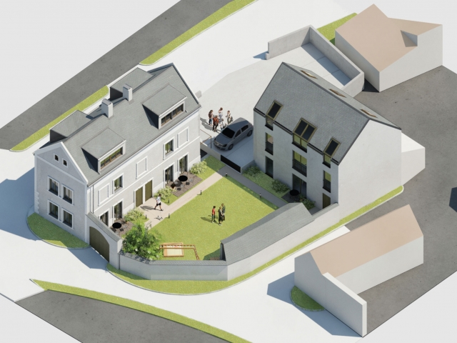 Stávající obytný dům - objekt A - o dvou nadzemních podlažích a podkroví bude z vnějšku rekonstruován do stavu blízkému své pravděpodobné původní podobě. Budou obnoveny všechny zdobné fasádní prvky a bude zachováno základní rozmístění okenních otvorů, případně budou otvory naznačeny ponechanými okenními šambránami. Střešní roviny budou rovněž zachovány a doplněny o střešní pultové vikýře, aby bylo možno využít půdní prostor stavby bez výrazného navýšení stavby. Interiér domu bude příčně rozdělen přes všechna tři patra na dvě poloviny, kdy každá bude řešena jako samostatná obytná jednotka. Hodnotné klenuté stropy v přízemí budou vytvářet kvalitní atmosféru nových obývacích prostor, v patře bude situována hlavní rodičovská ložnice a v podkroví pak dva dětské pokoje. Všechna podlaží budou vybavena sociálním zázemím. V suterénu stavby vznikne zázemí pro tyto i ostatní bytové jednotky souboru.