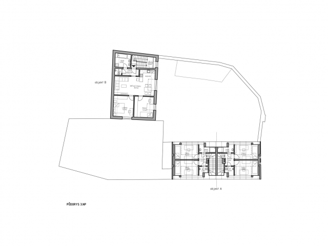 Stodola bude nahrazena objektem B ve stávajícím půdorysném rozsahu. Stavba bude zastřešen sedlovou střechou s hřebenem zvýšeným na úroveň původní obytné budovy, čímž bude umožněno v takto definované hmotě umístit rovněž dvě podlaží a obytné podkroví. Na rozdíl od původní obytné budovy zde budou obytné jednotky navrženy s dělením po patrech, obsloužené společnou vertikální komunikací situovanou při severním štítu stavby. Tři nové obytné jednotky pak jsou všechny základně děleny do dispozice 3+kk, která umístěním obývacího pokoje v centru půdorysu a pokojů při jižní fasádě ideálně zohledňuje mimo jiné možnost zajistit přirozené osvětlení pouze ve východní a jižní fasádě, jelikož ostatní stěny sousedí přímo s pozemky jiného vlastníka.