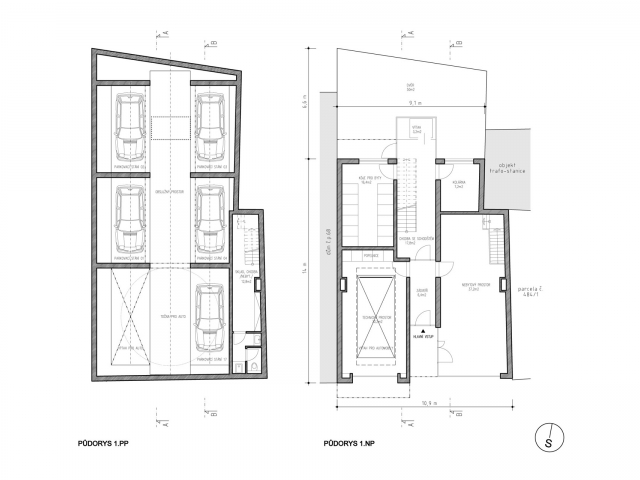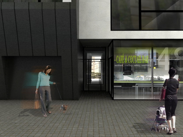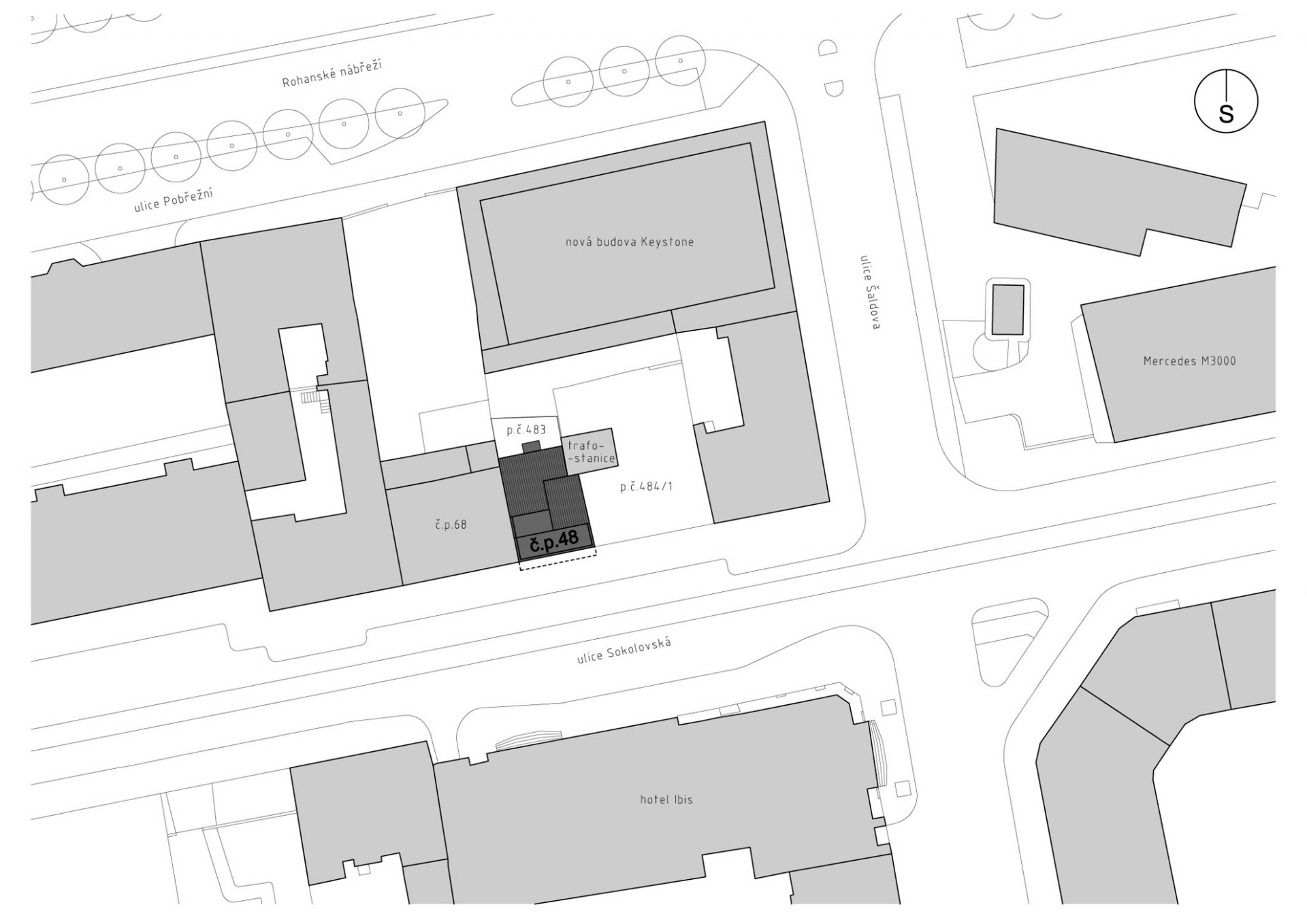 Navržená budova v podzemní části zabírá celou plochu pozemku. Je zde vytvořen prostor pro 17 vozidel. V nadzemní části se pak omezuje na hmotu menší, respektující rozměrově hloubku navazující blokové zástavby. Výškově koresponduje s vedlejším domem č.p.68 tak, že se především snaží navázat na hlavní římsu, poslední dvě podlaží pak uskakují podél štítu objektu č.p. 68, aby hlavní hmota navrženého objektu nepřesáhla sousední střechu ani její hřeben. S velkou pravděpodobností bude v budoucnu zastavěna i parcela číslo 484/1 (dnes proluka) a tím se kompletně uzavře uliční fronta viz. zákres do fotografie – architektonicko-stavební část.