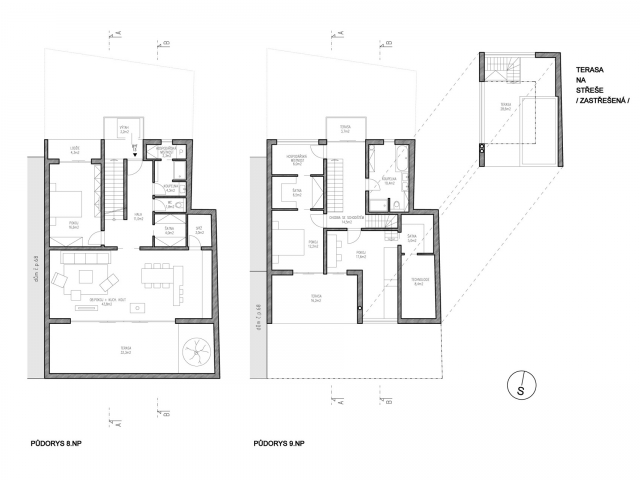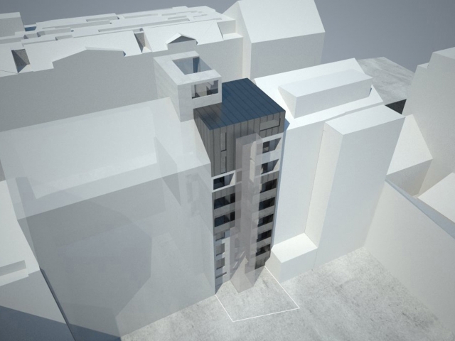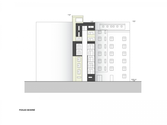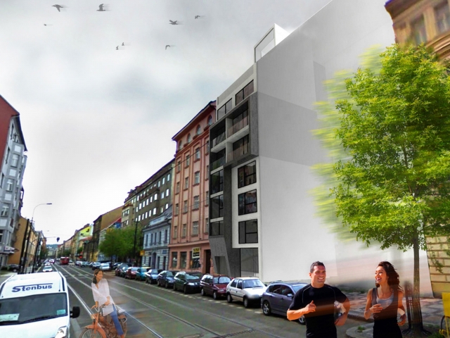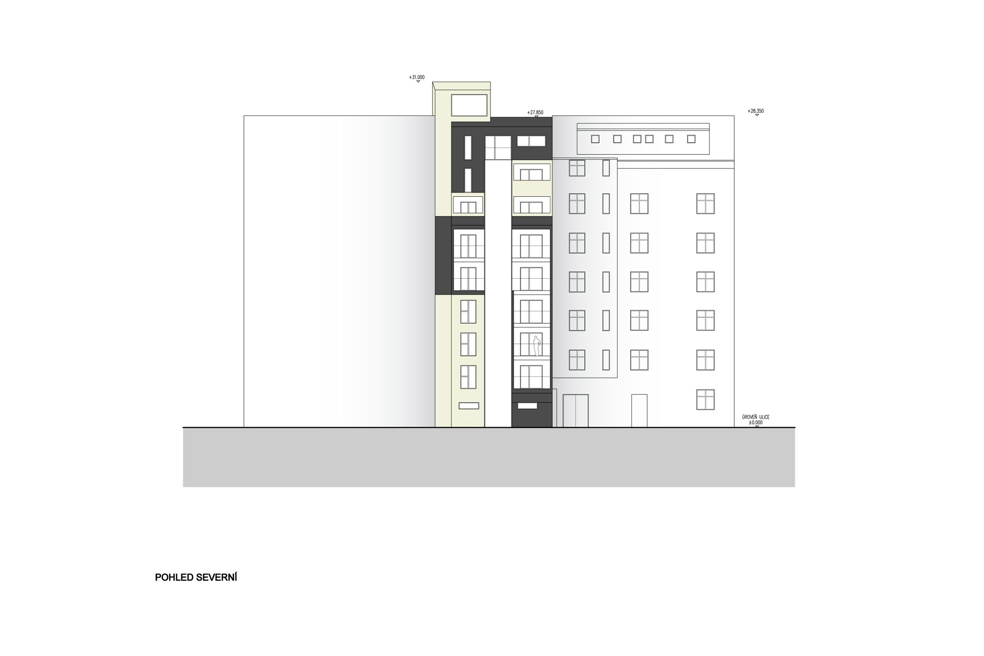 Na pozemku v Praze 8 - Karlíně je navržena budova bytového domu s 13 bytovými jednotkami o devíti nadzemních a třech podzemních podlažích sloužících jako podzemní garáže.