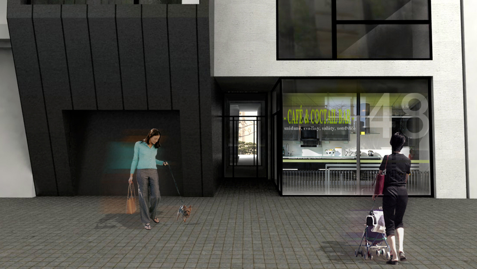 V prvním nadzemním podlaží obdélníkového půdorysu o hlavních rozměrech 10,9m x 13,95m je situován hlavní vstup do objektu, vjezd pro vozidla, nebytový prostor a část zázemí. Další nadzemní podlaží jsou čistě obytná. Každý byt je navržen tak, aby měl obytné místnosti orientované do uliční i klidné dvorní části.