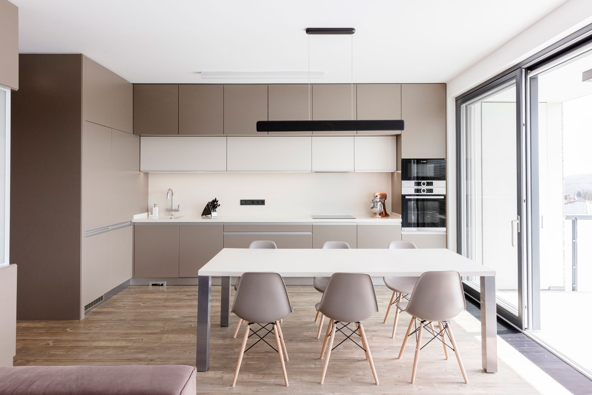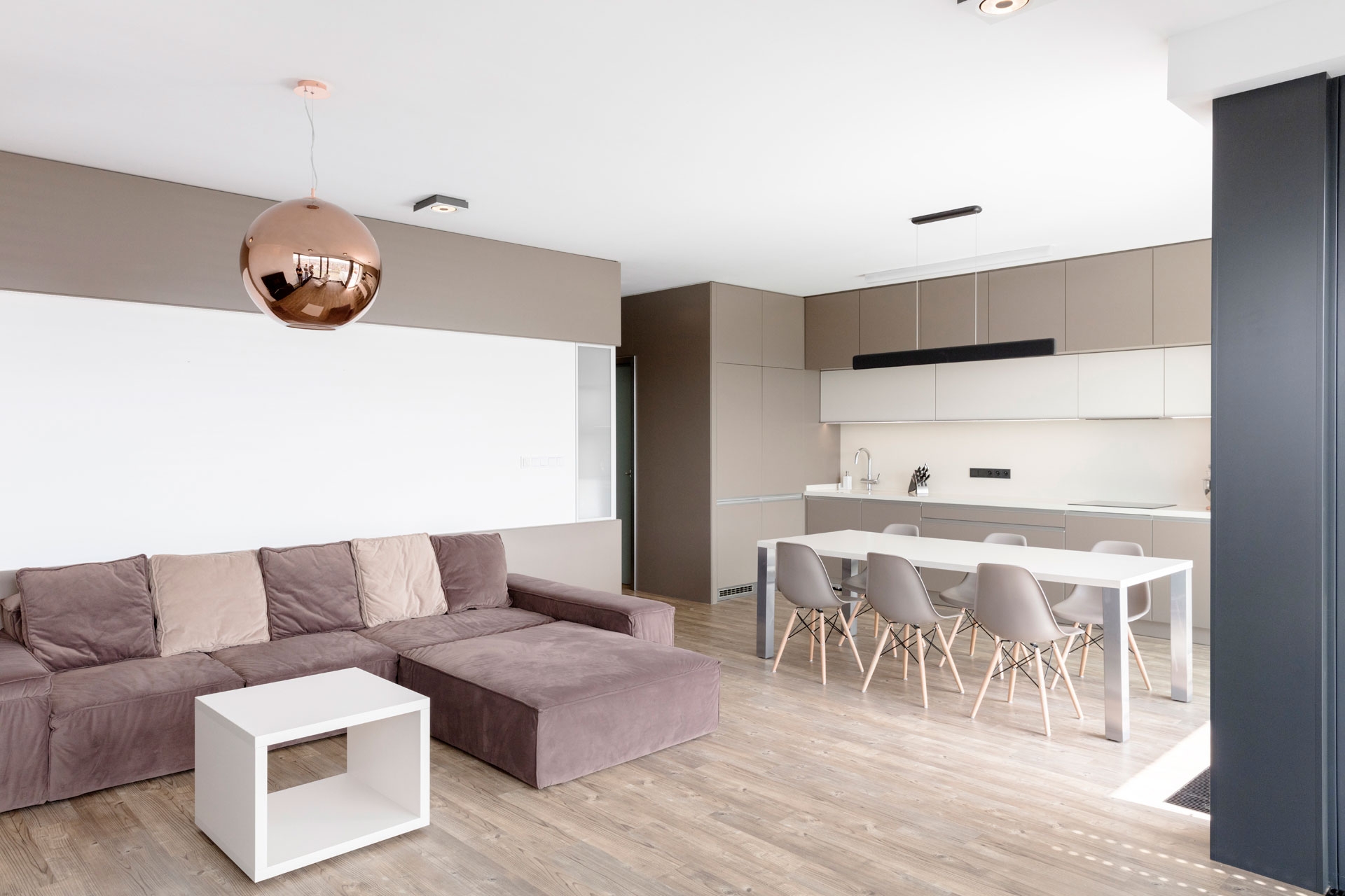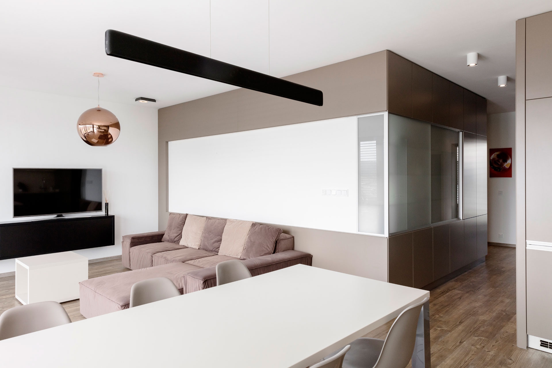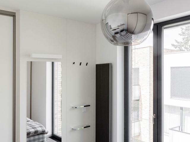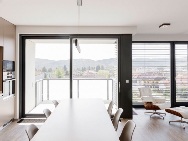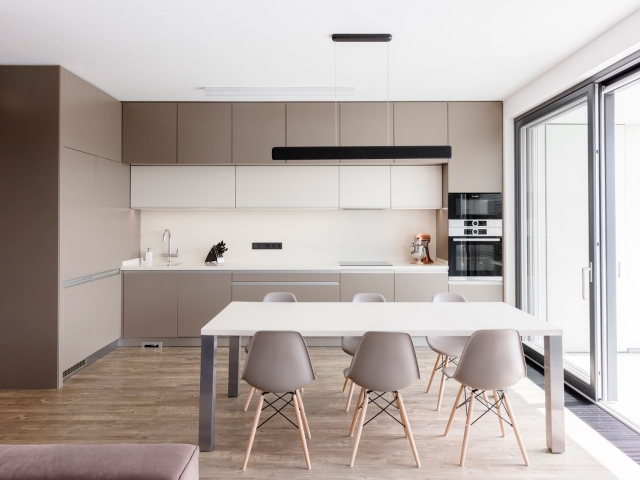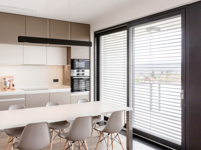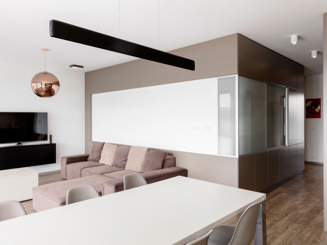 Interiér bytu v Černošicích jsme navrhli jako záměrně tlumeně barevný, s důrazem na jednoznačné linie. Naším záměrem bylo vytvořit vizuálně čistý a tvarově jasně definovaný prostor, který by dal vyniknout největšímu benefitu celého bytu - panoramatickému výhledu do okolí skrz francouzská okna. Na jejich velké skleněné plochy navazuje rovina stěn a vestavěného nábytku, jež do sebe navzájem plynule přecházejí. Nábytek a další zařizovací prvky jsou tvarovány velmi racionálně. Hlavní prostor je koncipován jako obývací, s jídelní částí a kuchyňským koutem.