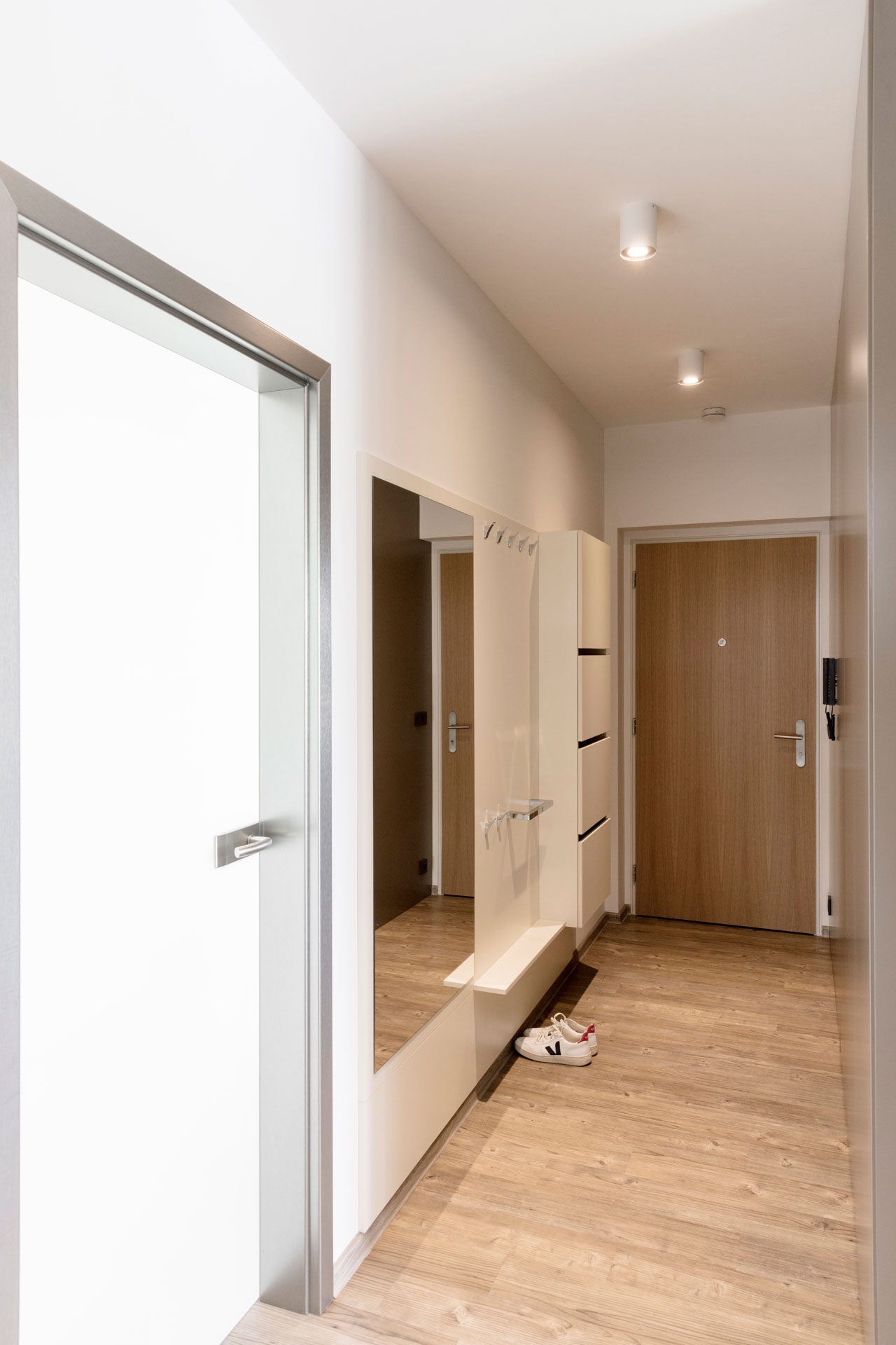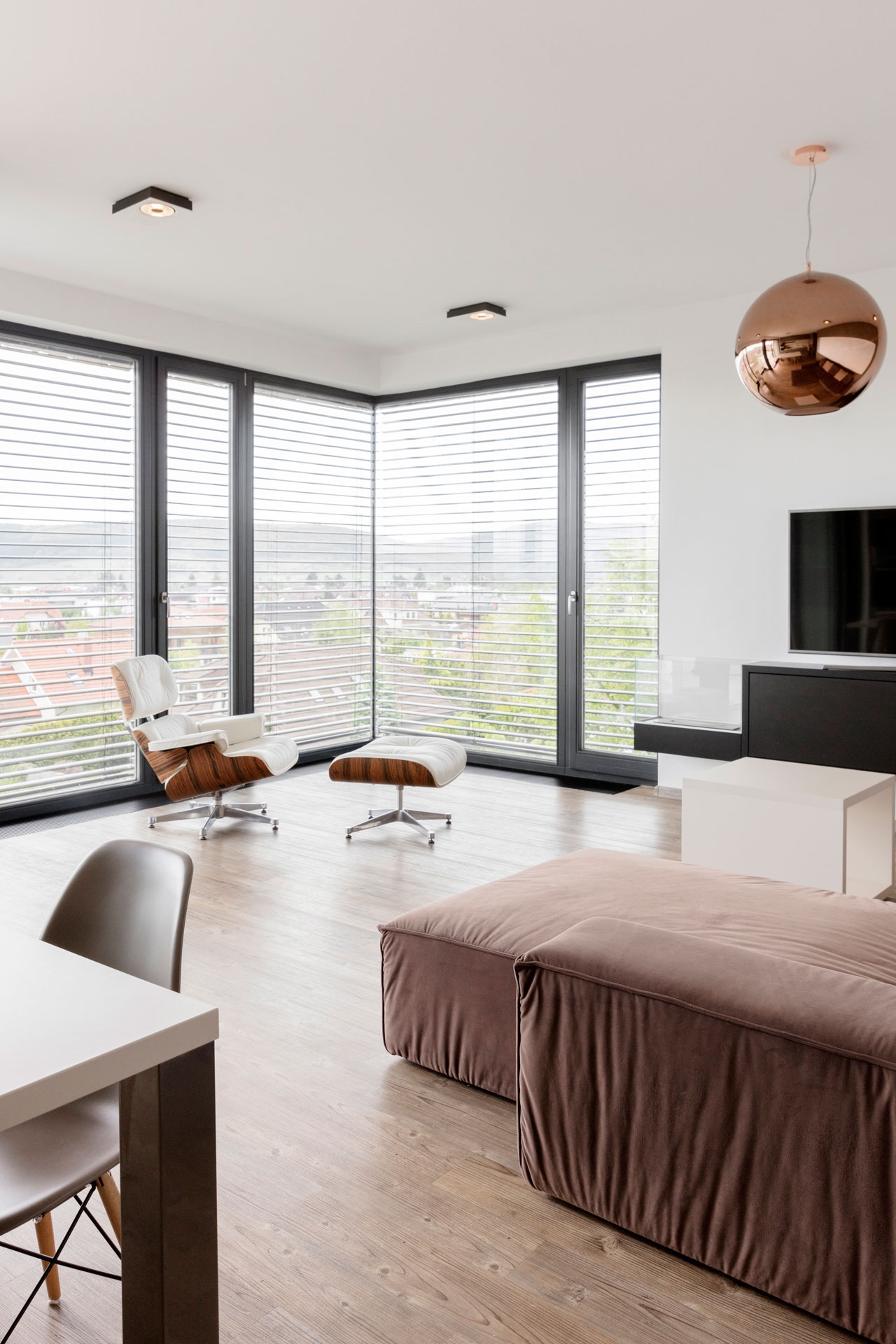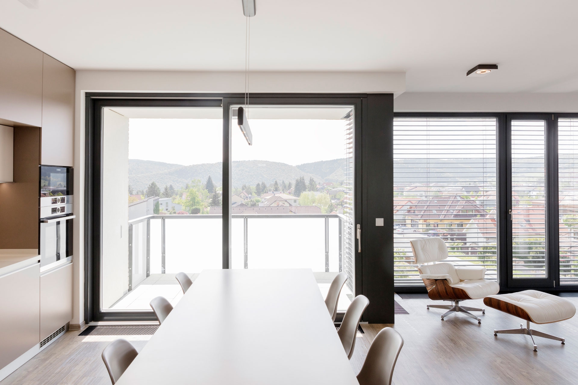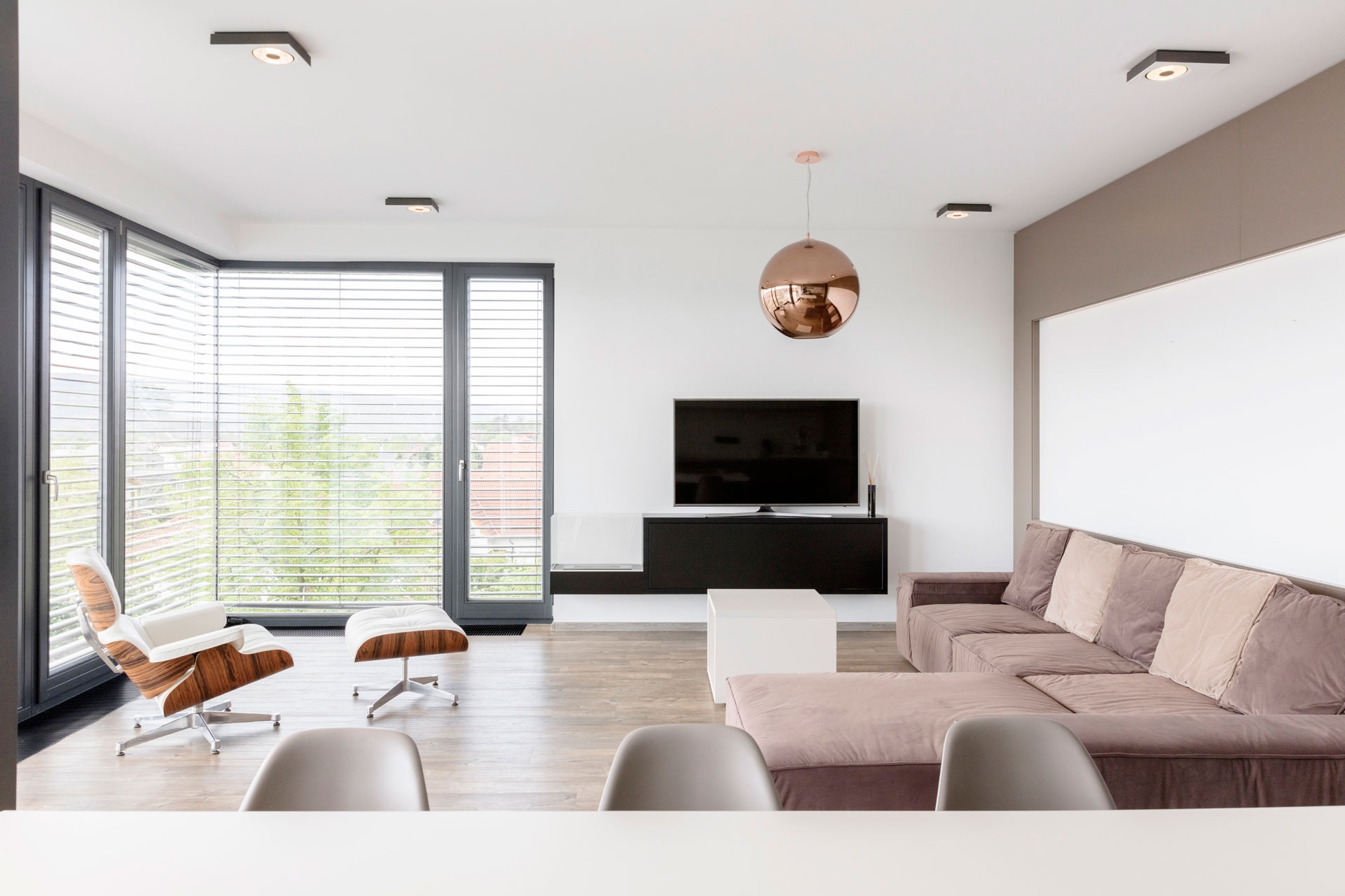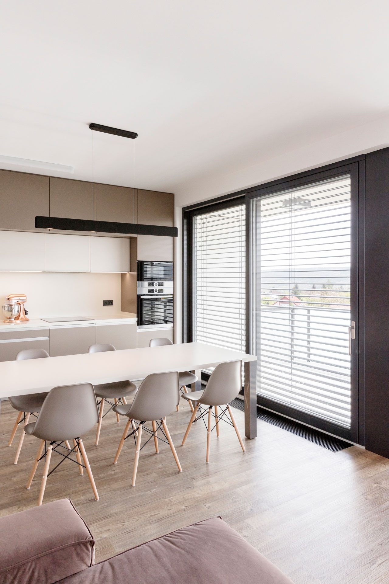 Interiér bytu v Černošicích jsme navrhli jako záměrně tlumeně barevný, s důrazem na jednoznačné linie. Naším záměrem bylo vytvořit vizuálně čistý a tvarově jasně definovaný prostor, který by dal vyniknout největšímu benefitu celého bytu - panoramatickému výhledu do okolí skrz francouzská okna. Na jejich velké skleněné plochy navazuje rovina stěn a vestavěného nábytku, jež do sebe navzájem plynule přecházejí. Nábytek a další zařizovací prvky jsou tvarovány velmi racionálně. Hlavní prostor je koncipován jako obývací, s jídelní částí a kuchyňským koutem.