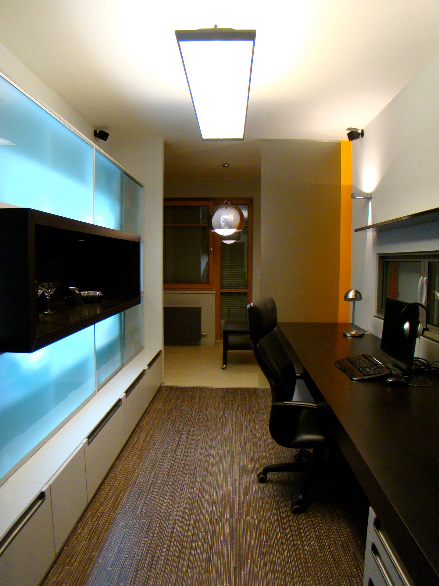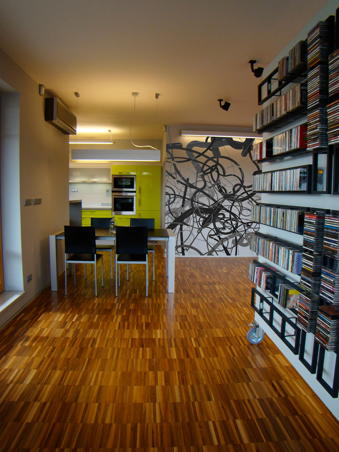 Řešení interiéru stojí na minimalistickém pojetí s prvky ryze funkčního charakteru, a to zejména v případě pracovny, která se nachází uprostřed bytu a stává se tak jeho pomyslným srdcem. Specifickým požadavkům klienta vychází vstříc řada atypických, důvtipně řešených prvků. Například interiérové okno mezi pracovnou a obývacím pokojem, které v otevřeném stavu oba prostory propojuje, avšak po zakrytí speciálním panelem naopak izoluje pracovnu od okolí a zajišťuje nerušený klid na tvůrčí práci. Dalším nevšedním řešením je speciálně vytvořená televizní stěna, kterou lze otočit až o 270° a výrazně tím změnit prostorové uspořádání hlavní místnosti. Za jejím vznikem stojí triviální zadání mít možnost sledovat televizi z různých částí bytu, především z obří terasy. Podobnými řešeními a originálními detaily je interiér zcela prostoupen.