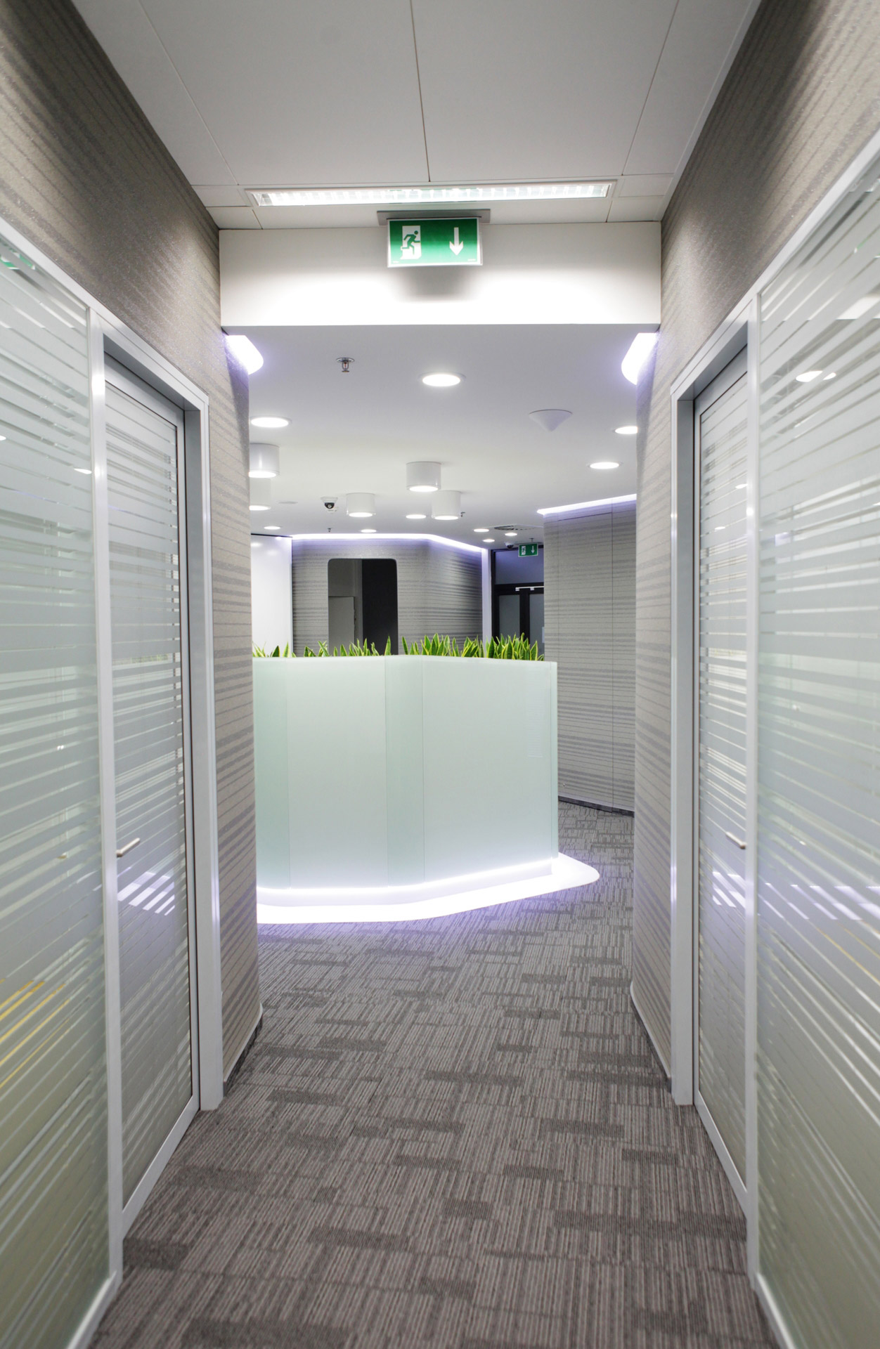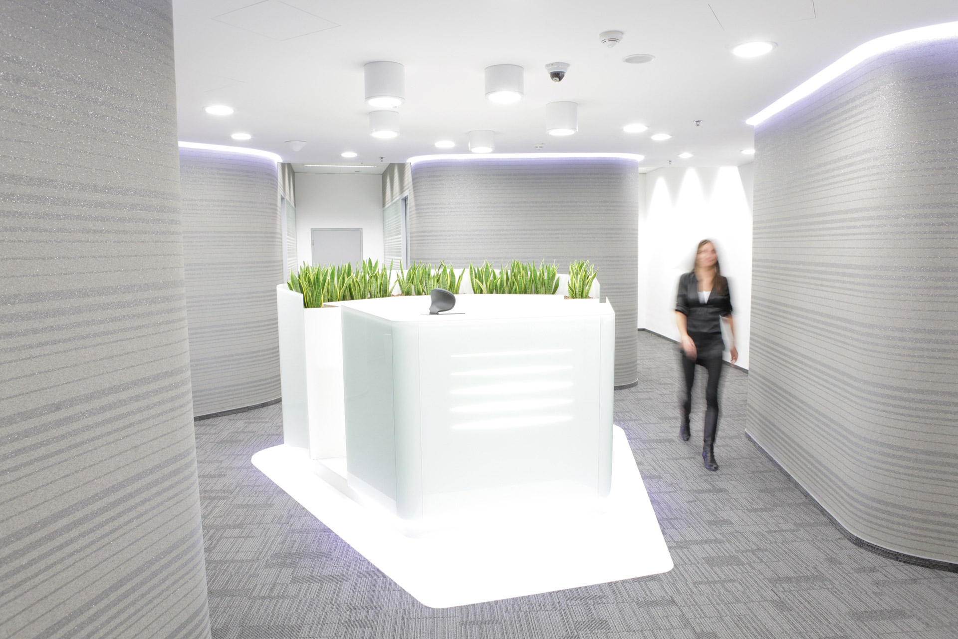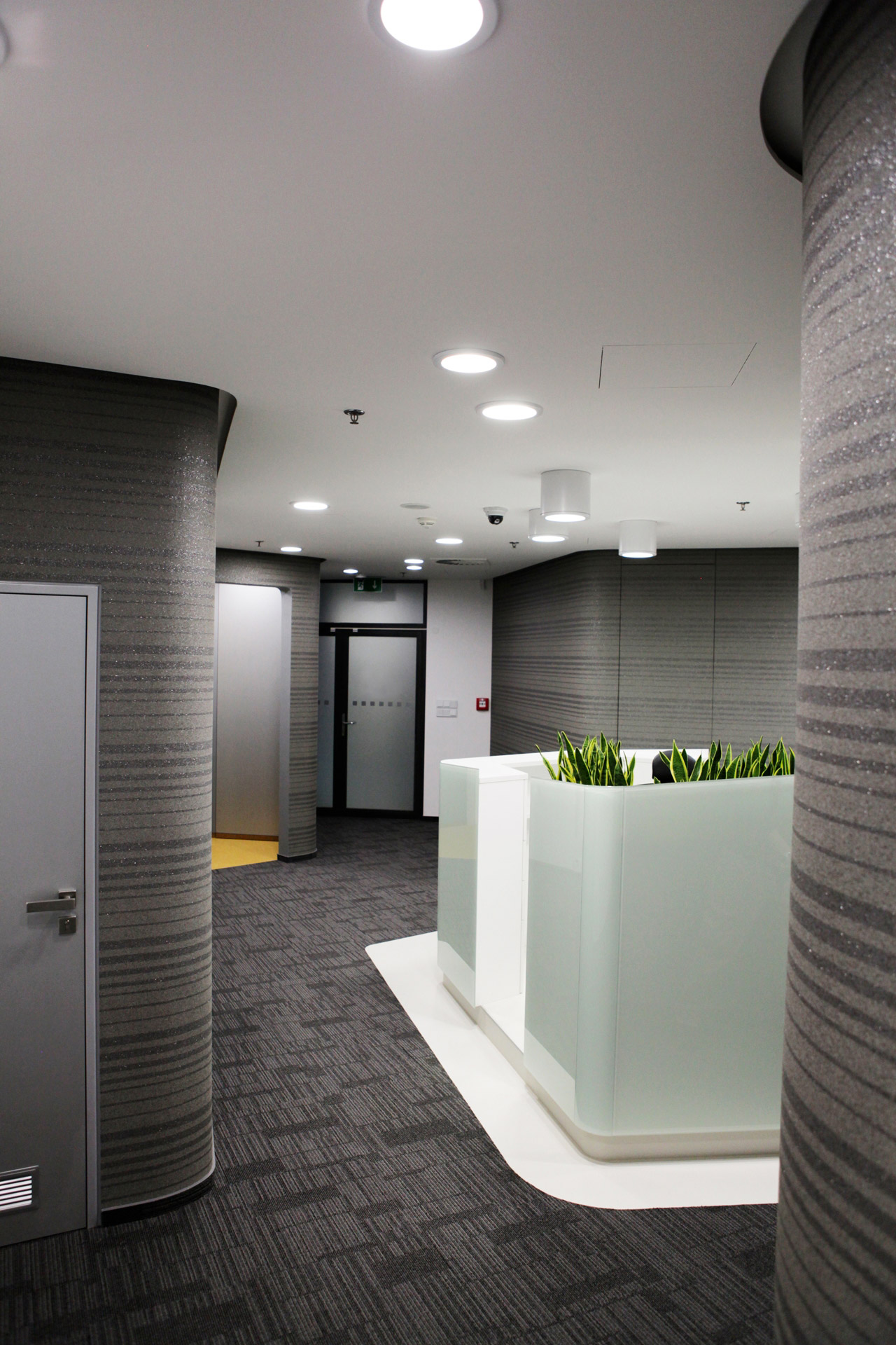 Na dispozici společných komunikačních prostorů (chodba s výtahy a schodišti) navazuje v námi řešeném, jihozápadním, křídle vstupní prostor. Jedná se o halu se solitérně pojatou, skleněným obalem obepnutou, recepcí uprostřed a zálivem se sezením pro návštěvy. Odtud lze pokračovat do prostoru s toaletami, místnosti s kuchyňkou nebo komory se serverem. Dvě komunikace vedoucí z haly hlouběji do křídla objektu řeší rozdělení podlaží na část se zasedacími místnostmi a kancelářskou zónu, přičemž dvě zasedací místnosti jsou situované v těsné blízkosti vstupní haly. Obě komunikace ústí do velkoprostorové kanceláře, kde jsme navrhli přístup do dalších tří menších, oddělených kanceláří.
