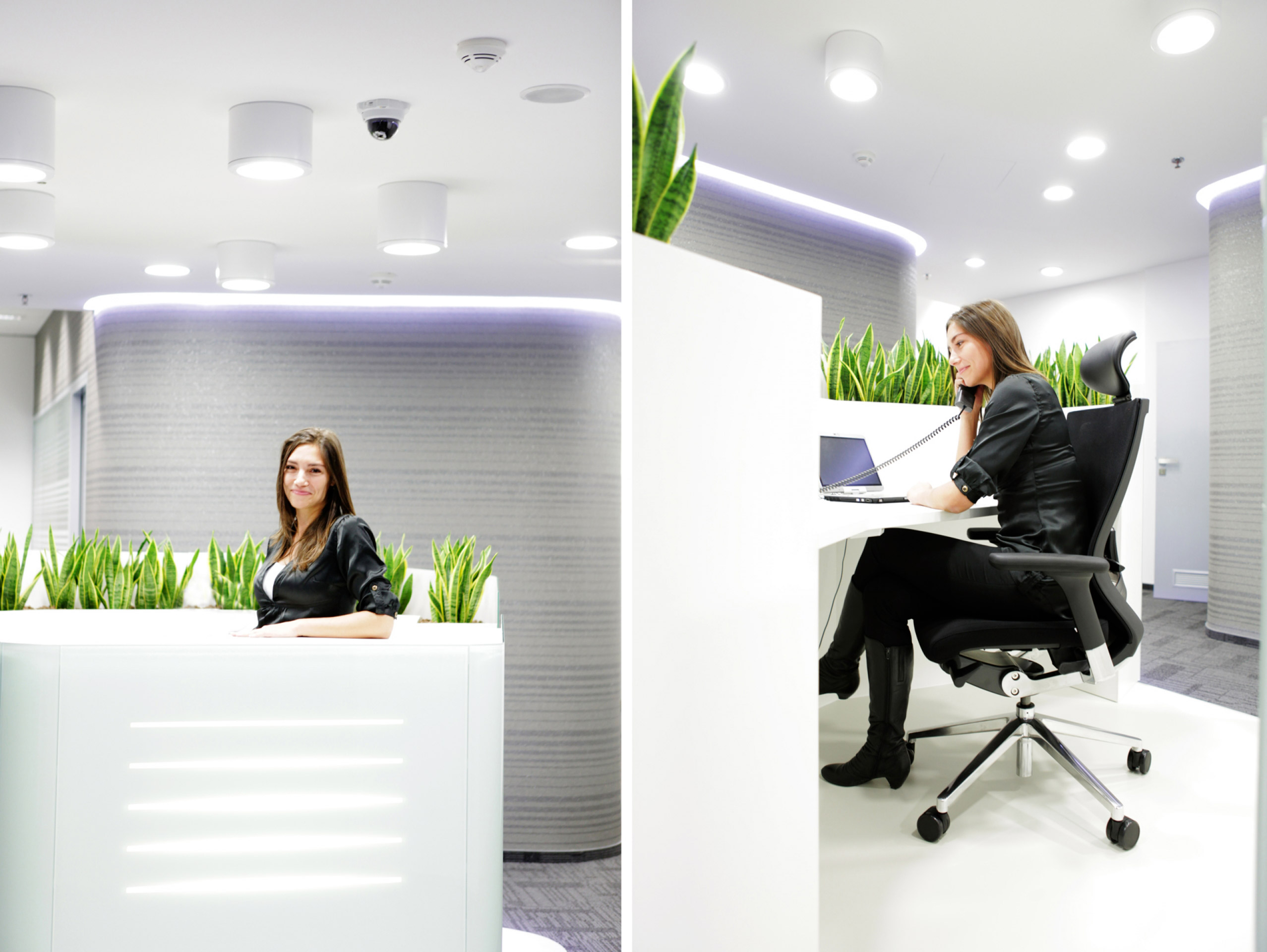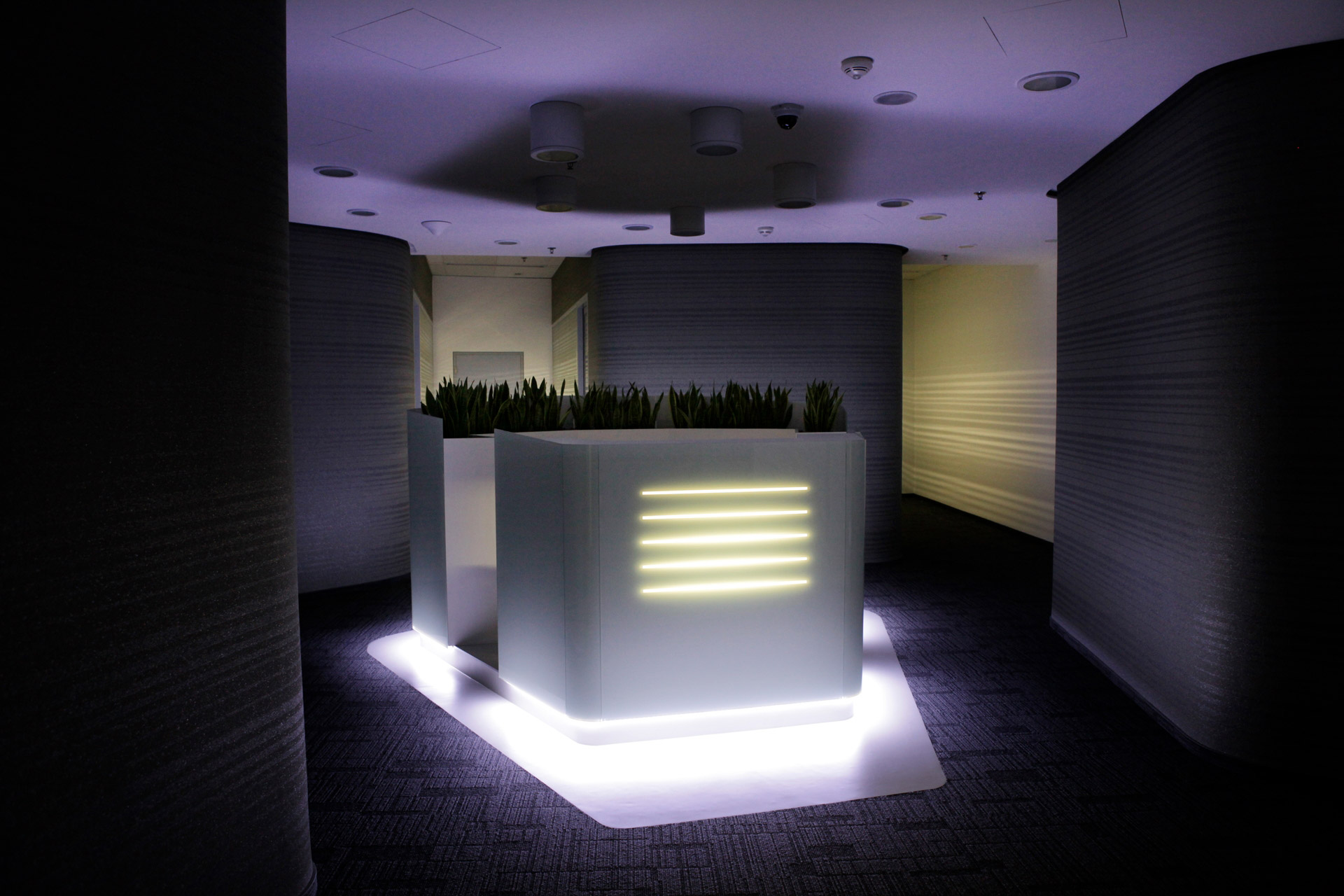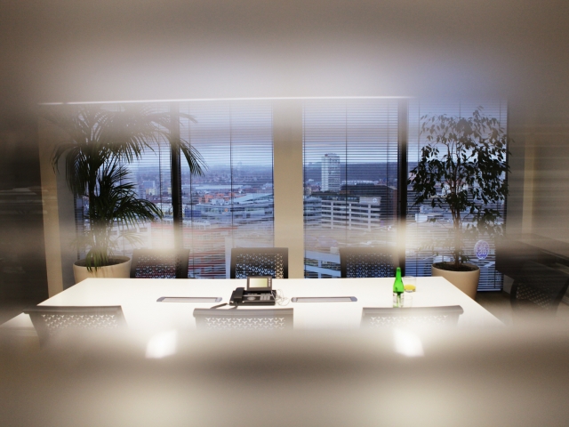 Na dispozici společných komunikačních prostorů (chodba s výtahy a schodišti) navazuje v námi řešeném, jihozápadním, křídle vstupní prostor. Jedná se o halu se solitérně pojatou, skleněným obalem obepnutou, recepcí uprostřed a zálivem se sezením pro návštěvy. Odtud lze pokračovat do prostoru s toaletami, místnosti s kuchyňkou nebo komory se serverem. Dvě komunikace vedoucí z haly hlouběji do křídla objektu řeší rozdělení podlaží na část se zasedacími místnostmi a kancelářskou zónu, přičemž dvě zasedací místnosti jsou situované v těsné blízkosti vstupní haly. Obě komunikace ústí do velkoprostorové kanceláře, kde jsme navrhli přístup do dalších tří menších, oddělených kanceláří.