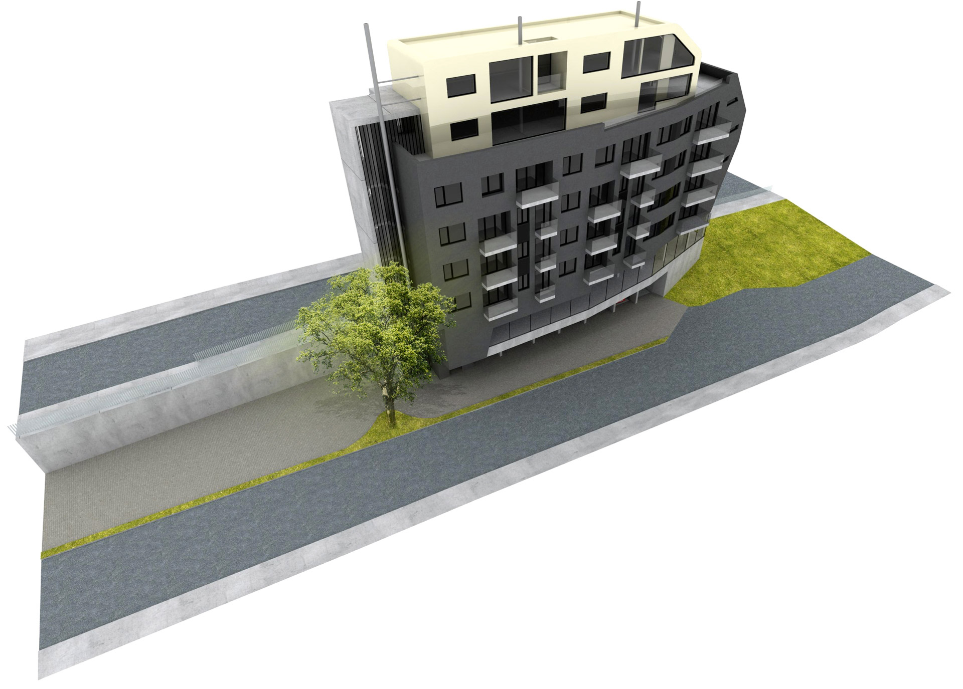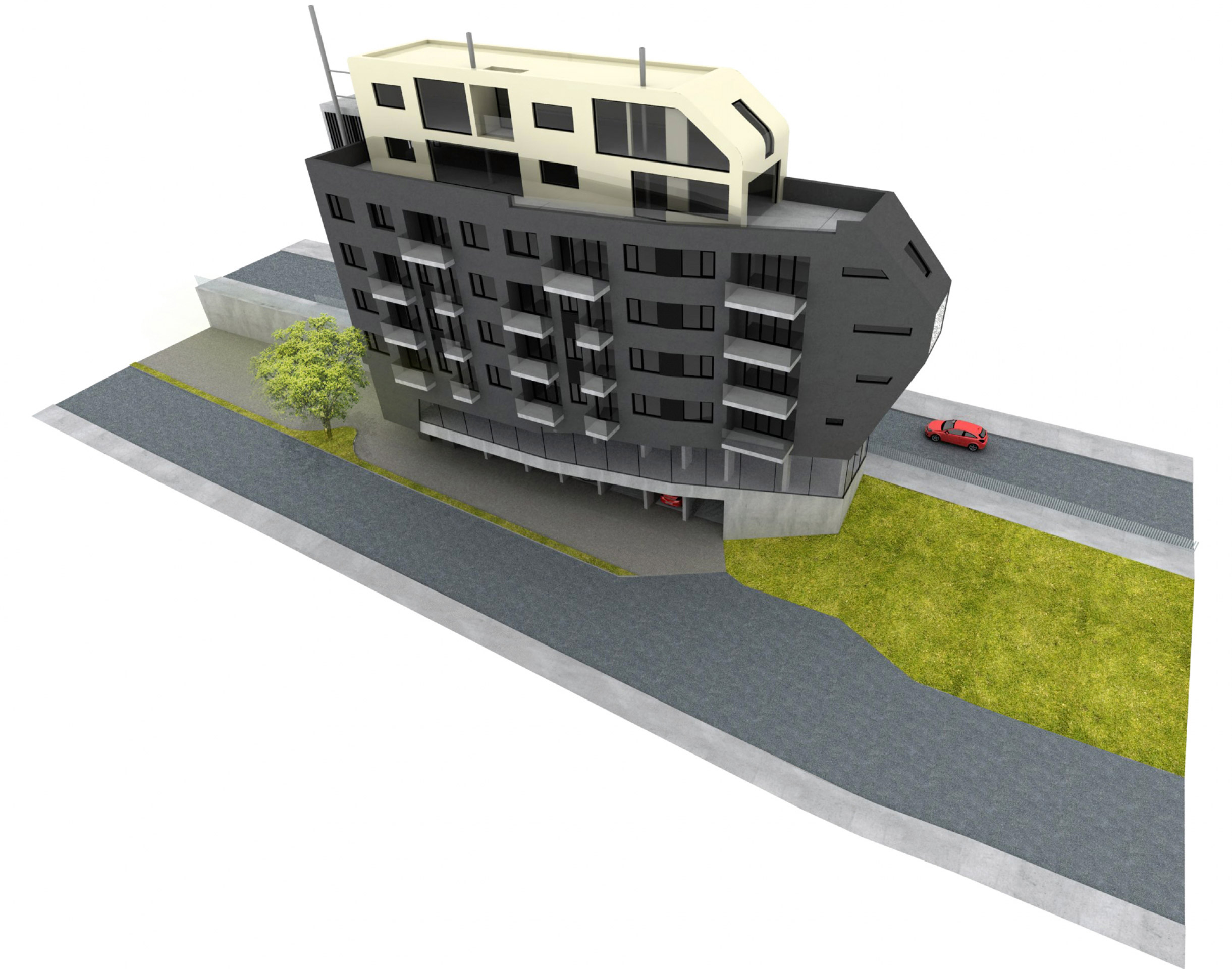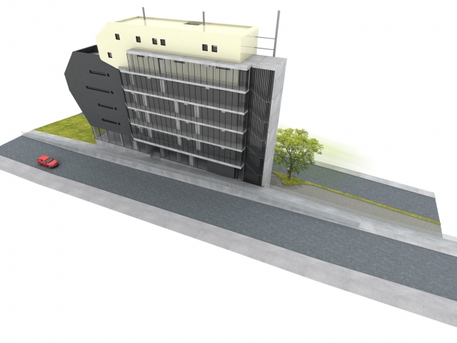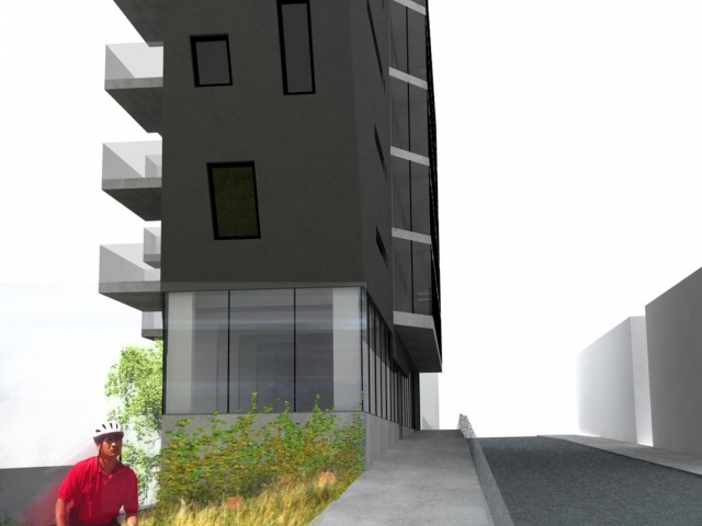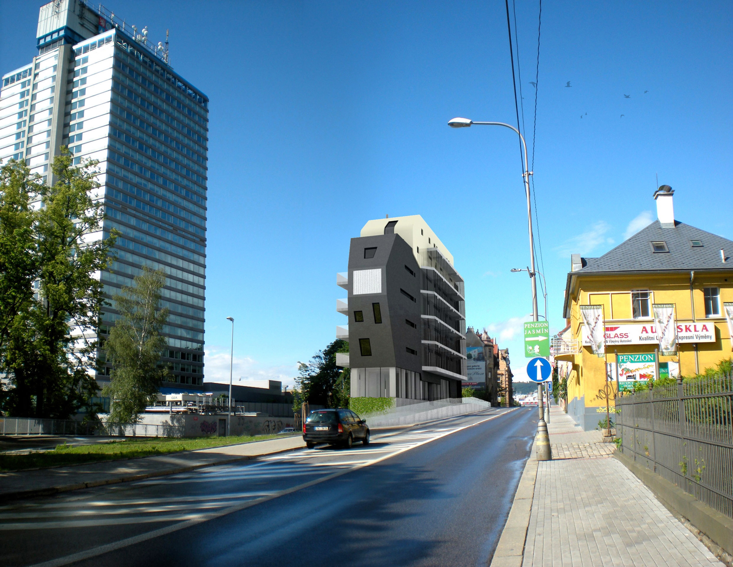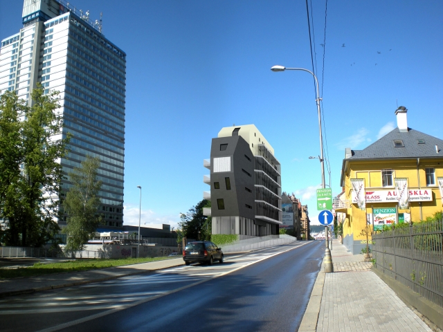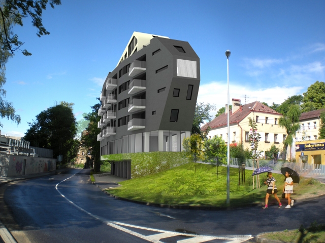 Horáková apartment building is located near the centre of Liberec. The building is connected to an existing built-up area and one side completes a block of buildings while the other side forms a corner between two roads. The building responds to these connections with its dynamic, arrow-like shape. The newly constructed building also comprises a tangible transition from the neighbouring high-rise Regional Authority building and a residential area. The building has one underground floor with garages and seven above-ground floors, of which the first is intended for commercial use and the remaining ones for residential use. Entry into the property is arranged together with servicing of the neighbouring property from Náchodská street.