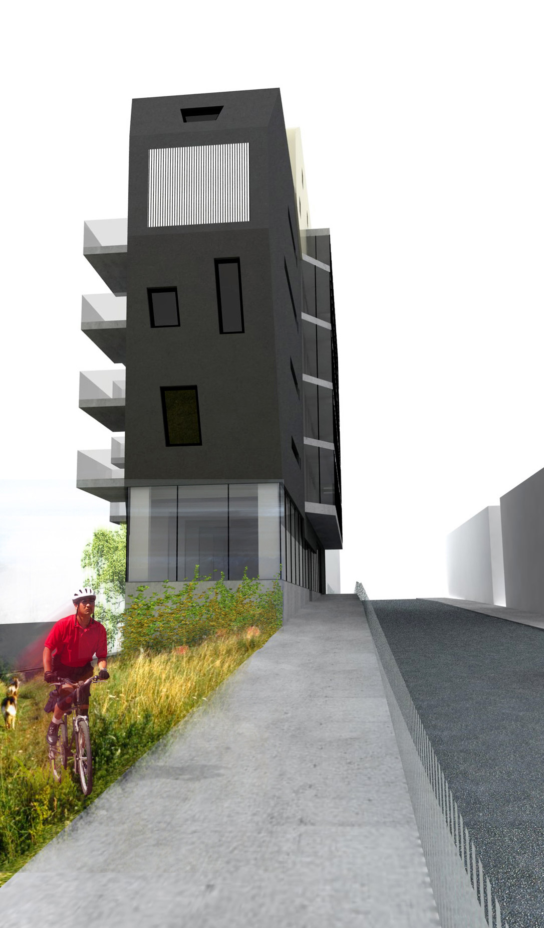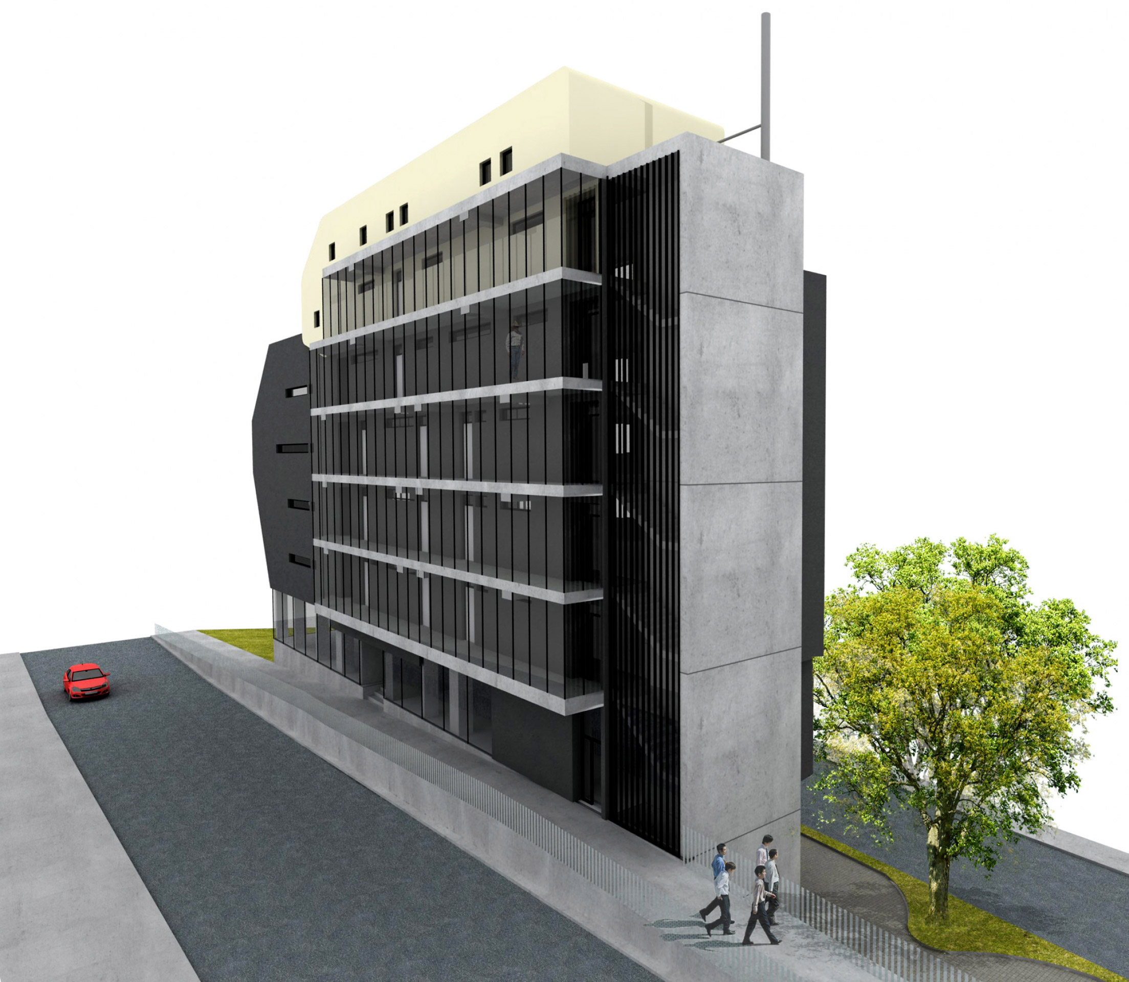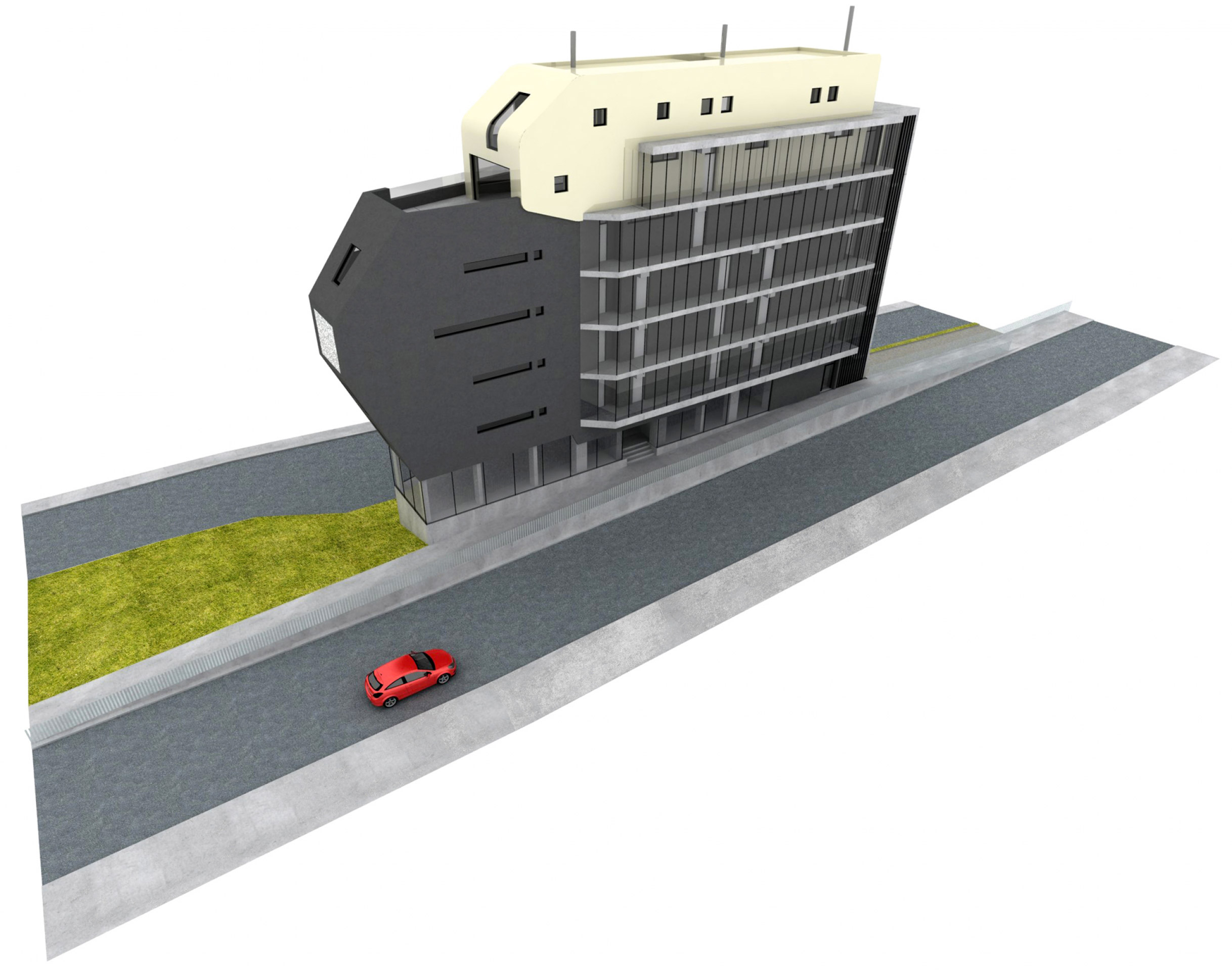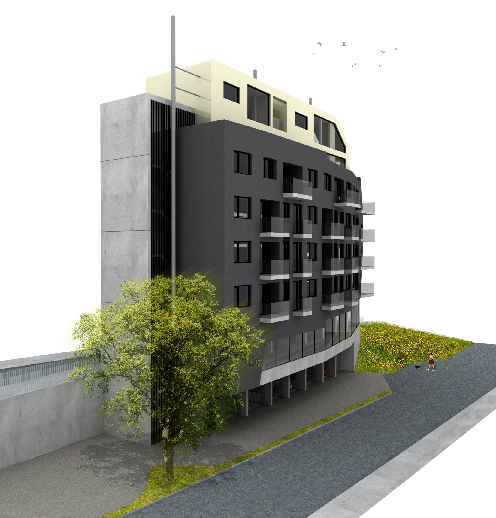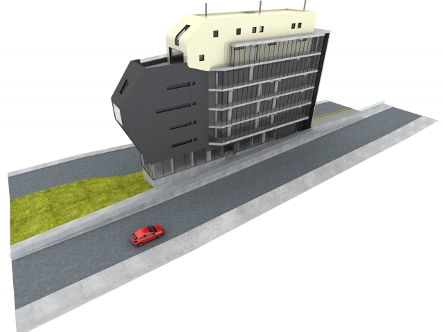Horáková apartment building is located near the centre of Liberec. The building is connected to an existing built-up area and one side completes a block of buildings while the other side forms a corner between two roads. The building responds to these connections with its dynamic, arrow-like shape. The newly constructed building also comprises a tangible transition from the neighbouring high-rise Regional Authority building and a residential area. The building has one underground floor with garages and seven above-ground floors, of which the first is intended for commercial use and the remaining ones for residential use. Entry into the property is arranged together with servicing of the neighbouring property from Náchodská street.