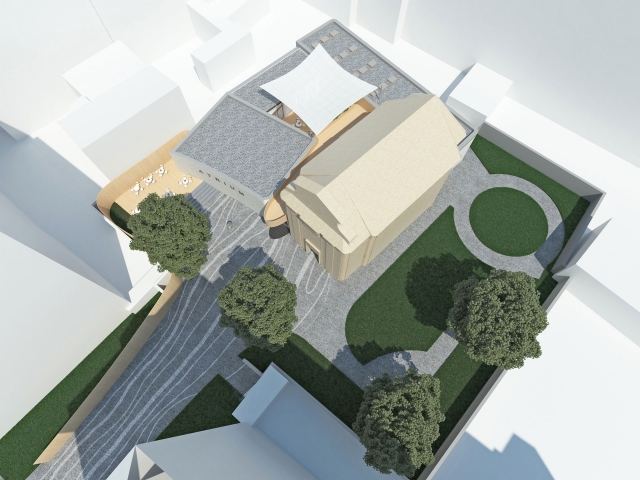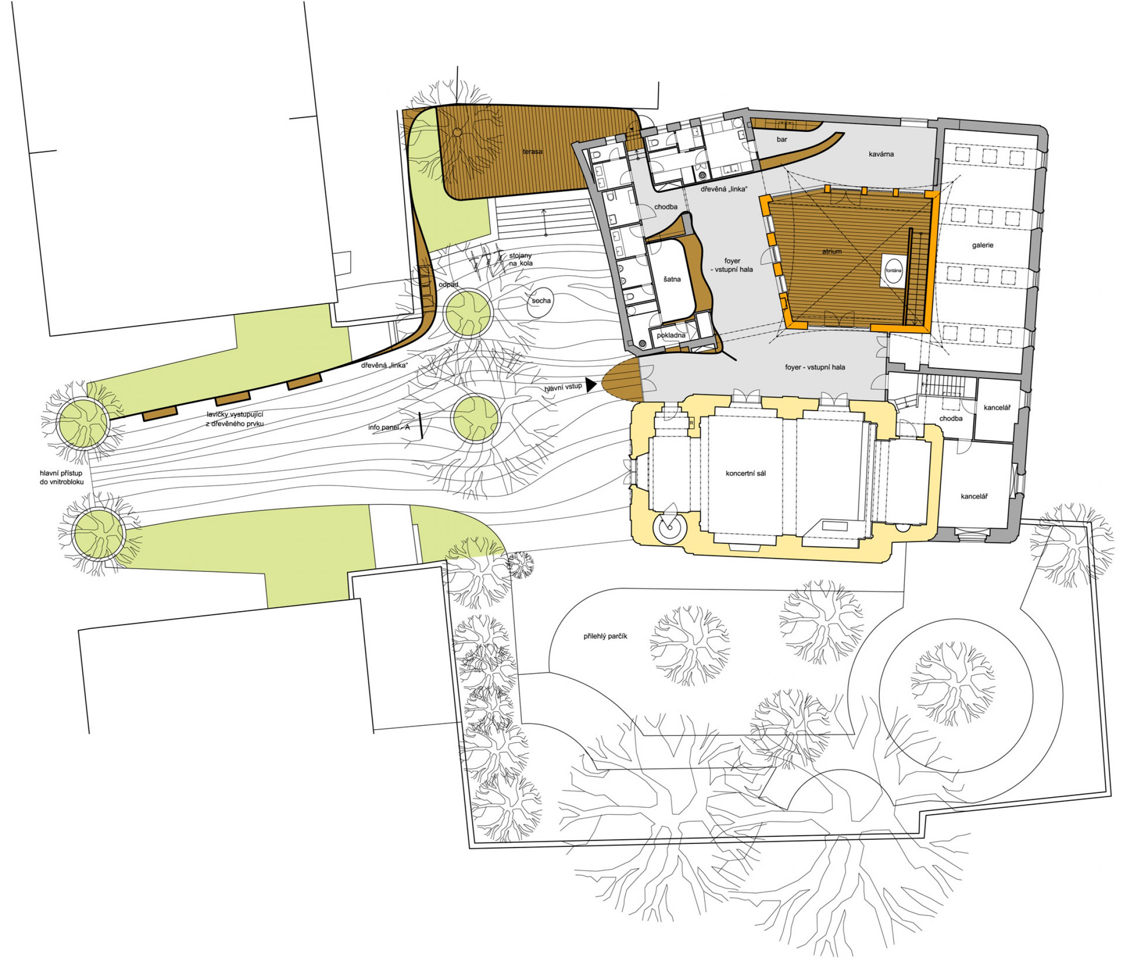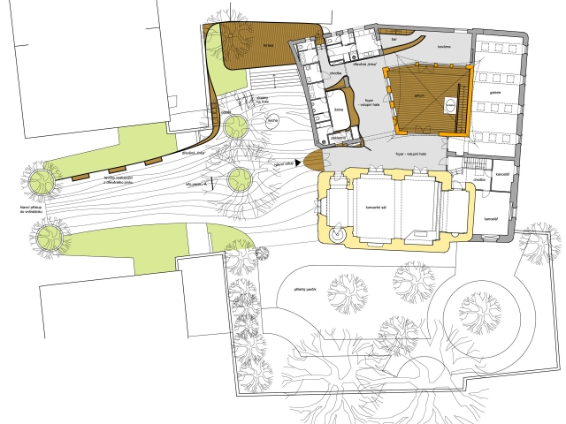 Our concept for the new design of the building consists primarily in reducing the individual constituent parts to two main elements determined by their characteristic shape, design and date of origin. One element is composed of the church’s vertical structure from the beginning of the 18th century; the other will be created through unification of the horizontal extensions from the end of the 20th century using a common feature that will tie them together and provide a functional and visual connection with the adjacent open space. This element will be a characteristic wooden “line” freely traversing the exterior and interior of the structure. The horizontal element will thus gain a more dignified form generated by its close coexistence with the Baroque structure.