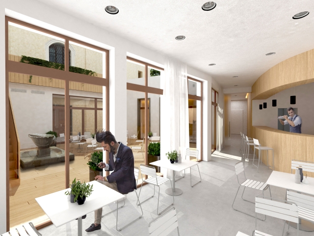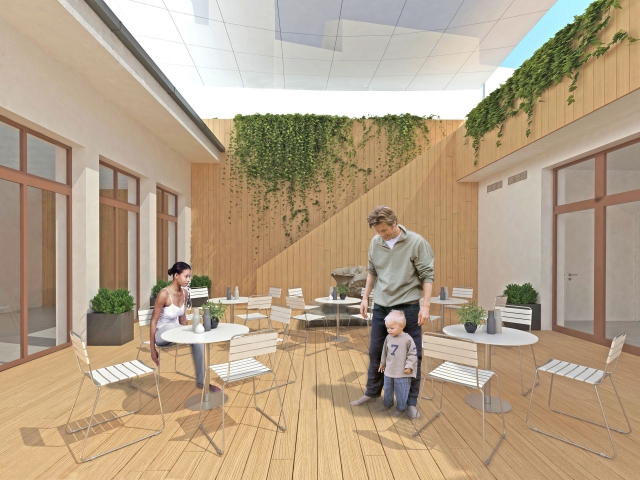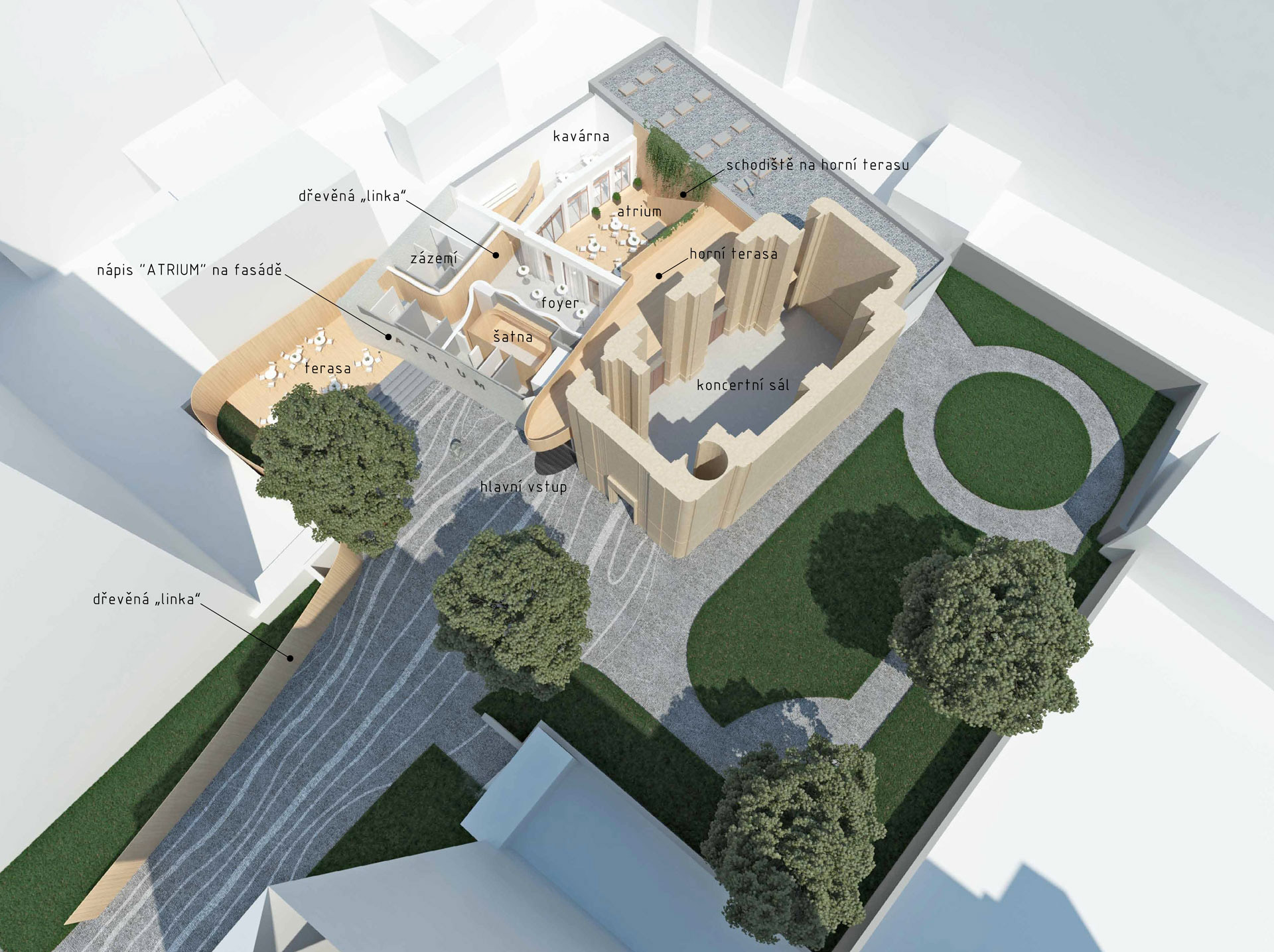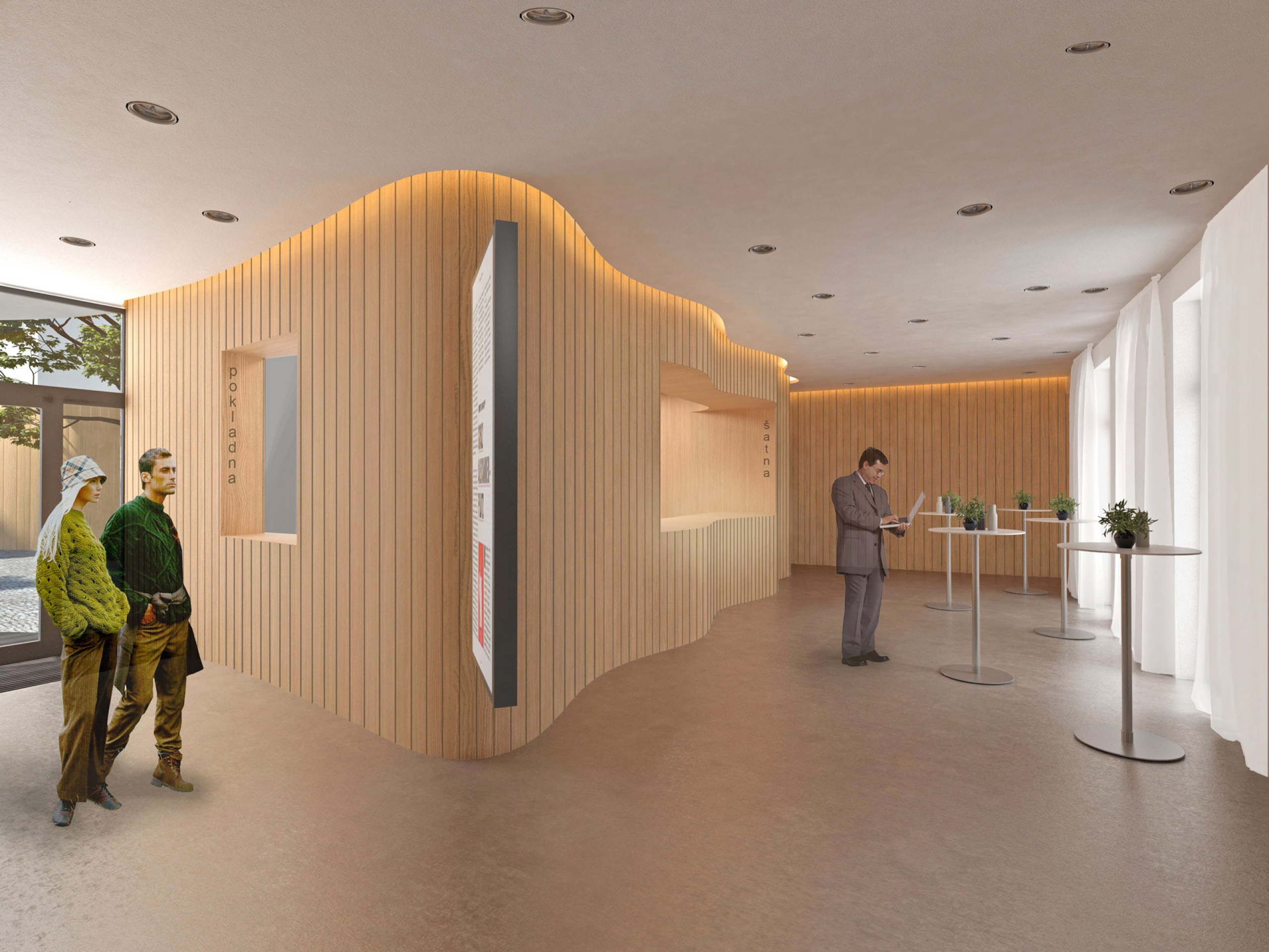 The planned wooden wall will further run past the raised part of the courtyard, where a wooden deck will be created, and proceed to the interior of the horizontal structure. There, as the continuous wall cladding skirts the cloakroom and bar and enters the inner Atrium, it transitions into the floor, then ascends along the wall and over the new outdoor staircase to the roof with a new rooftop terrace with a stretched awning in the form of a commanding bridge to the area above the building’s main entrance. The Atrium will be newly covered with a loosely suspended membrane.