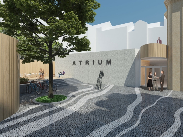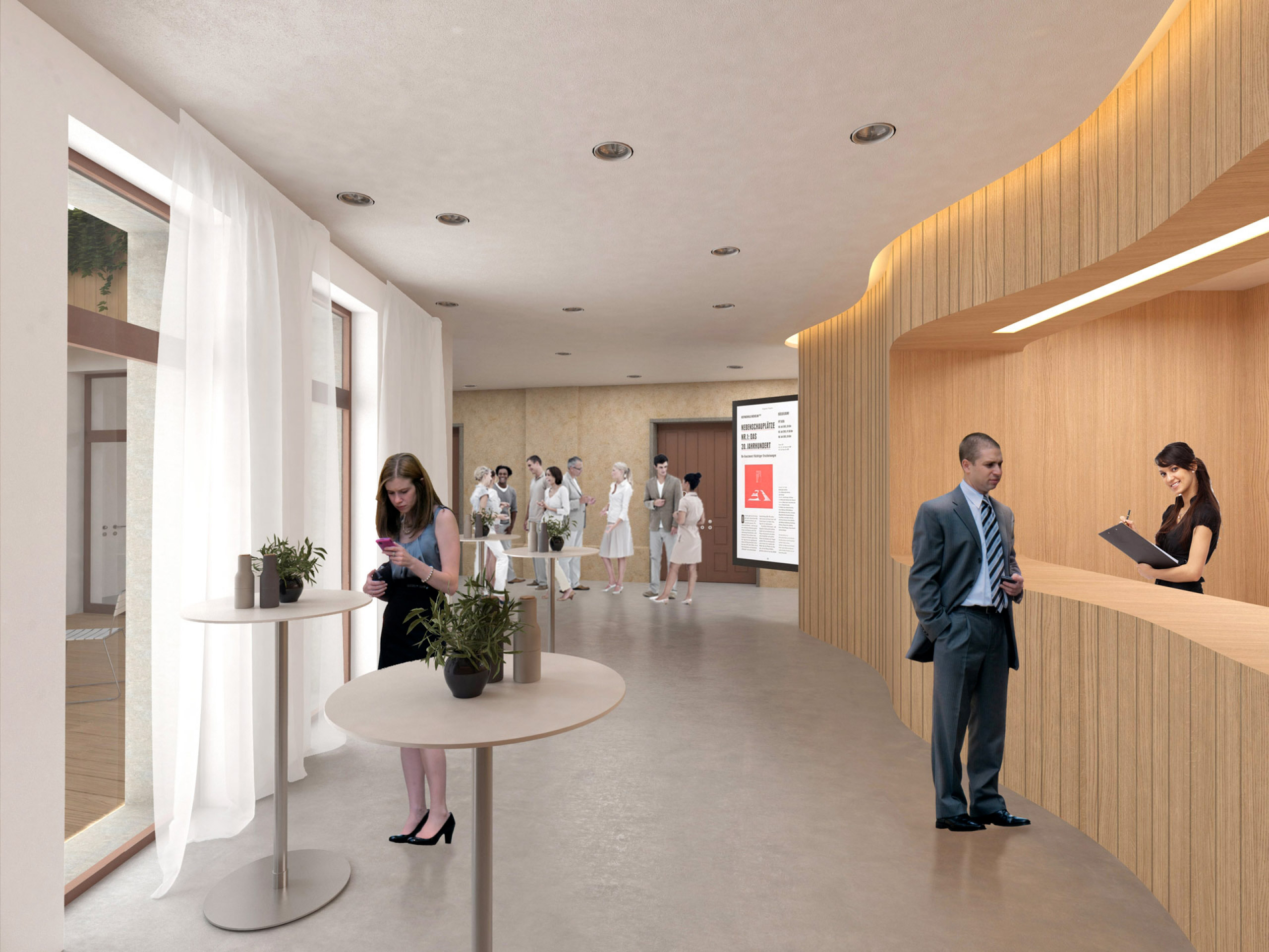 The proposed changes affect the entrance area and the public space, where metal fencing will be removed and the existing tiles will be replaced with light and dark limestone cubes laid in a loosely linear pattern in the direction of the ATRIUM building. Along the north side of the “courtyard”, a guide line will be created in the form of a wall of wood panelling. These elements will bring about improved connection between the structure and the entrance, eliminating the separation and submersion of the building in the depths of the courtyard.